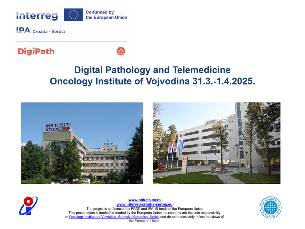 31.3.2025. na Institutu za onkologiju Vojvodine održan je radni sastanak partnera u IPA projektu Digipath. Na sastanku je diskutovano o ishodima i nabavkama u prvom projektnom periodu, a izneti su i planovi za drugi period. Načelno je dogovoreno da se sledeći sastanak održi u Osijeku u toku septembra, kada će već uveliko biti završena instalacija poručene opreme i kada će se moći sumirati prvi rezultati prekogranične saradnje u oblasti digitalne patologije.